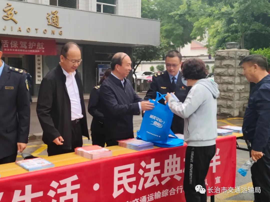 为贯彻落实第三个“民法典宣传月”活动要求,长治市交通运输局积极开展民法典主题系列宣传活动,进一步营造出办事依法、遇事找法、解决问题用法、化解矛盾靠法的良好法治氛围,让《民法典》走进群众身边、走进群众心里。5月30日,长治市交通运输局党组书记、局长王克,局党组成员、副处级干部王德强,局党组成员、市交通运输综合行政执法队队长周会彦及局、队相关科室工作人员在宣传现场向过往群众发放民法典宣传资料,并与群众热情交流。